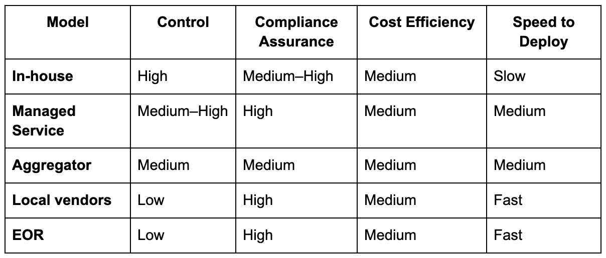 - Local vendors: Local payroll providers handle payroll for each jurisdiction, ensuring compliance with local regulations.